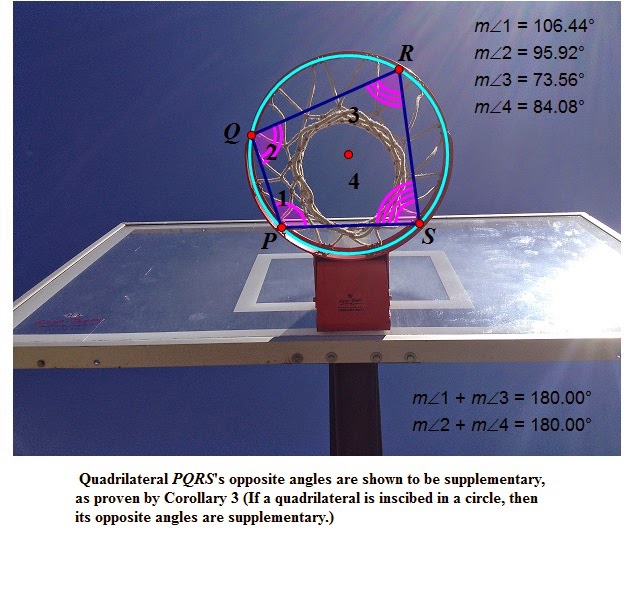 This corollary is clearly proven through the addition of the opposite angles of the quadrilateral I drew within this circle on GSP. (~AI5)